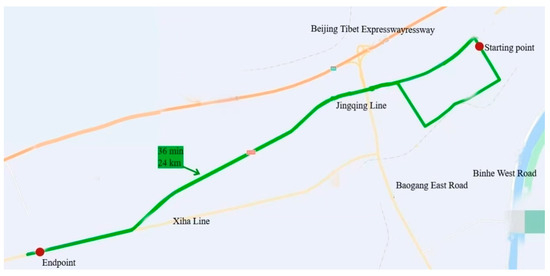 To demonstrate the effectiveness of the MWHR in ETBSm, experimental tests were carried out on real roads, and the test route is shown in Figure 23. Cycling between start point A and end point B, the route length is about 24 km, and the average time consumed is about 36 min. The SOC of the battery was 100% at the beginning of the experiment, and the experiment ended when the SOC reached 20%. The test speed is determined by actual road conditions. Characteristics such as driving range and energy consumption of the ETBSm are recorded. The ratio of range improvement is shown in Figure 24. The results show that the maximum increase in driving range is about 12% when comparing the use of waste heat from the motor to PTC heating alone.