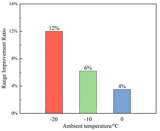 The improvement in driving range through waste heat recovery was analyzed at different ambient temperatures. At ambient temperatures of −20 °C, −10 °C, and 0 °C, when 75% of the SOC is consumed, the range is improved by 6.55%, 4.37%, and 4.49%, respectively.