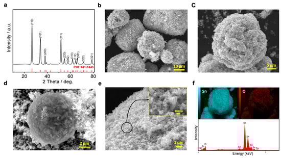 Physical characterizations of the SnO2 material. (a) XRD pattern; (b–e) SEM images at different magnifications; (f) EDS elemental and mapping analysis.