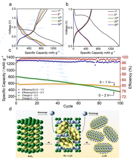 Electrochemical characterizations of SnO2 in different voltage ranges. (a) CGD curves in the 0–2 V range; (b) GCD curves in the 0–1 V range; (c) the capacity and Coulombic efficiency comparison during cycling; (d) the scheme of the conversion–alloy reaction mechanism. The electrolyte is 1 M LiPF6/EC-DEC (1:1 volume ratio, 10% FEC additives).