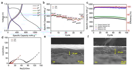 Electrochemical performance comparison of SnO2 in carbonate and ether electrolytes. (a) CGD curves in the 0–2 V range using the LiPF6/THF+m-THF electrolyte; (b) rate performance comparison; (c) the cycling performance comparison; (d) the impedance comparison; (e) the cross-sectional SEM image of the cycled electrode in the ether electrolyte; (f) the cross-sectional SEM image of the cycled electrode in the conventional carbonate electrolyte.