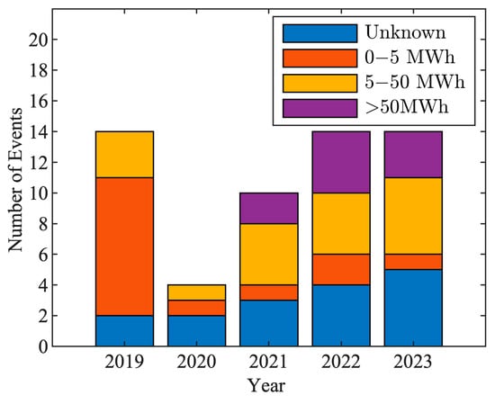 Nevertheless, LIBs continue to present certain safety concerns. On occasion, incidents of fire, deflagration, and even explosions occur in EVs and energy storage power stations, both domestically and abroad. The primary cause of such incidents is TR. From a macro perspective, during the operation of LIBs, when the heat generated inside the lithium battery is higher than the heat dissipation, the temperature of the LIB itself will rise with the increase in operating time. Upon reaching the critical temperature for TR, the heat generation within the battery will continue to increase due to the occurrence of side reactions. This will eventually result in the decomposition of active substances, leading to a significant rise in temperature and, ultimately, fire []. Statistics from the Electric Power Research Institute of the United States (EPRI) indicate that there have been a considerable number of safety incidents in energy storage power stations in recent years. The relevant statistical data on safety accidents in energy storage power stations in recent years (from 2019 to 2023) are presented in Figure 1. Specifically, the most significant failure events involving BESS from 2022 are listed in Table 1. These events have disastrous consequences due to huge initial investments and severe damage.