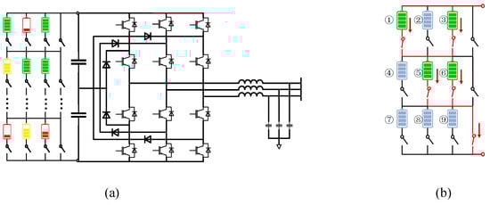 As illustrated in Figure 2b, a battery network comprises nine batteries from to . These batteries are arranged in three series units. The number of series units can be modified in accordance with the external voltage specifications. The system permits the bypassing or isolation of any series unit through a switch operation. While the battery can be reorganized arbitrarily within a series unit, reorganization of the battery elements in different series units is not permitted. The system selects and to form the first series unit in Figure 2b. and are chosen to form the second series unit. The third series unit is bypassed, which means that , , and are not working. However, the battery within different series units cannot be reorganized into new series units. Thus, for example, and cannot be connected in parallel. This paper primarily addresses the enhancement of reliability in BESSs based on this specific reconfigurable battery topology, integrating control strategies into the domain of BESS reliability analysis.
