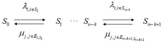 After merging the states, the simplified transition relationships between the various system states are shown in Figure 3. In the diagram, and () represent the failure rate of the transition from state to and the repair rate for the reverse process.