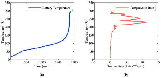 Figure 5 shows the different stages of the TR process. In the first stage, the temperature in the incubator rises slowly, but the battery does not self-heat. In the second stage, represents the loss of thermal stability. Subsequently, the SEI decomposes and the internal heat accumulates. In the third stage, marks the triggering of TR, an internal short circuit occurs inside the battery, the temperature rise rate increases sharply, gas is generated and rapidly accumulated, and a jet flame is easily formed. is the maximum temperature that the battery can reach. Thus, the accurate identification of the onset of TR is an effective method of early warning, which can prevent the occurrence of fire accidents.