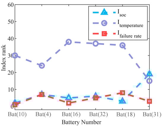 Given the inherent variability in battery parameters, operating states, such as SOC, and temperature exhibit discrepancies across batteries operating under identical working conditions. During the dispatch task from the grid, this study employs the risk indicators proposed in Section 4.1 to identify the weak points in the BESS. Figure 8 presents the identification of six weak batteries using the proposed in this study.