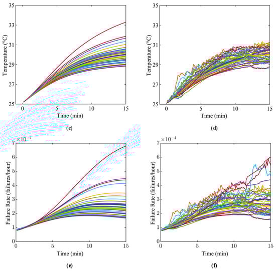 As illustrated in Figure 7, the battery failure rate displays a fluctuating pattern, initially increasing and then declining. This pattern is observed because, during the initial phases of the discharge process, the temperature of the battery increases, thereby elevating the probability of TR. However, as the battery continues to operate, the SOC gradually decreases, and the of the battery’s self-heating reaction rises. As the temperature differential between the battery and the self-heating reaction temperature increases, the safety margin improves, resulting in a gradual decrease in the failure rate.