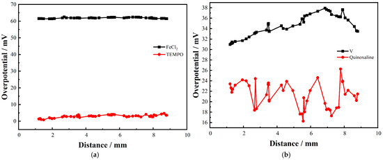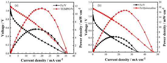 Figure 2 shows the polarization curves of the four battery groups: Fe/V and TEMPO/V (a); and Fe/V and Fe/Quinoxaline (b). The voltages of the TEMPO/V and Fe/Quinoxaline groups are significantly higher than those of the Fe/V group, indicating that the total of activation polarization, ohmic polarization, and concentration polarization is minimized, reducing internal polarization and achieving less voltage loss.