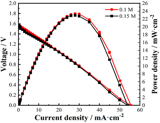Polarization tests were conducted on the TEMPO/Quinoxaline single cells under two conditions: the optimal concentration of TEMPO in the DESs (0.15 M) and the optimal concentration of Quinoxaline (0.1 M). The results are shown in Figure 4. Under the condition of a 0.1 M concentration, the cell achieved a peak power density of 23.38 mW·cm−2 and a maximum current density of 55.73 mA·cm−2. Under the condition of a 0.15 M concentration, the peak power density and maximum current density were 22.95 mW·cm−2 and 53.99 mA·cm−2, respectively. Comparatively, at a concentration of 0.1 M, both the peak power density and maximum current density were slightly higher. Compared with the Fe/V battery, the peak power density and maximum current density of the TEMPO/Quinoxaline battery at 0.1 M concentration increased by 277.50% and 59.32%, respectively. The higher peak power density indicates that the TEMPO/Quinoxaline battery has a greater power output capacity per unit time.