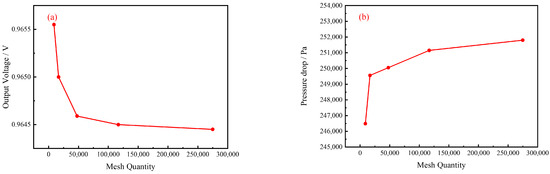 Variation in output voltage (a) and voltage drop (b) with mesh quantity.
