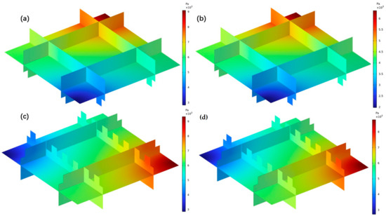 Cloud diagram of pressure drop distribution in electrodes with different electrolytes. (a) FeCl2, (b) TEMPO, (c) VCl3, (d) and Quinoxaline.
