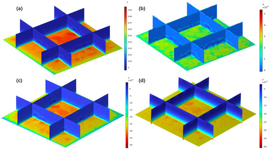 Cloud diagram of overpotential distribution of different electrolytes in electrodes. (a) FeCl2, (b) TEMPO, (c) VCl3, (d) and Quinoxaline.