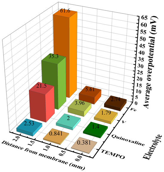 Figure 13 shows that there are significant differences in the average overpotentials at different distances from the membrane. On the surface of the flow battery electrodes, it is observed that the average overpotential increases significantly closer to the membrane adjacent areas. This phenomenon reveals that electrochemical reactions primarily occur near the membrane, which can be attributed to far superior electronic conductivity in the electrodes compared to effective ionic conductivity in the electrolyte. Therefore, in the DES flow batteries, the limitation of electrochemical reactions primarily stems from the ion transport process but not the electron transport process, indicating that ion migration in the electrolytes is the key factor in optimizing flow battery performance [34]. This conclusion emphasizes that enhancing the ion transport efficiency in the electrolyte is crucial when aiming to improve flow battery performance. Consideration should be given to using electrolytes with high ionic conductivity, enhancing the material transport characteristics at the membrane–electrode interface. Future research needs to delve deeper into the interactions between ion transport near the membrane and electrochemical reaction kinetics and how these interactions affect the specific mechanisms of flow battery performance to guide the achievement of more efficient energy conversion and a longer battery life.