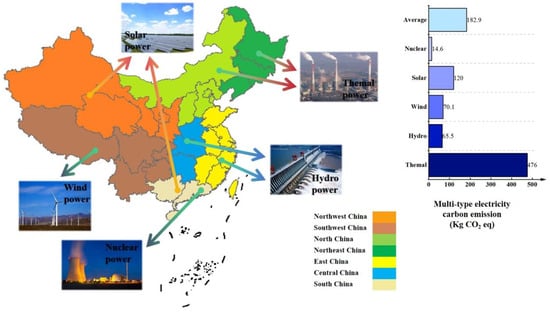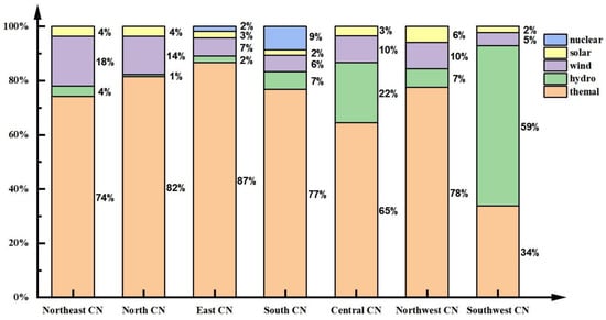 Variations in energy infrastructure and electricity generation methodologies exhibit pronounced regional disparities across diverse geographic zones within China []. Figure 3 illustrates the composition of the power generation infrastructure across various regions.