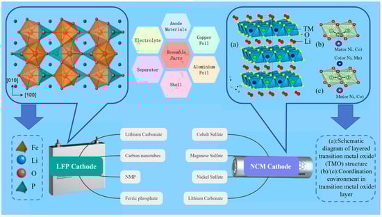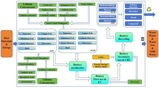 Electrochemical energy storage systems, specifically power batteries, are pivotal in facilitating the widespread adoption of electric vehicles. Lithium-ion batteries have emerged as the predominant power source for new energy vehicles, owing to their superior energy density, minimal self-discharge rates, and extended operational lifespan. Among the various types of lithium batteries, ternary lithium batteries (NCM) and lithium iron phosphate batteries (LFP) dominate the lithium battery market []. By the end of 2022, ternary lithium batteries (NCM) accounted for 60% of the global electric vehicle battery market, while the use of lithium iron phosphate batteries (LFP) batteries has increased significantly, with their market share growing from 6% in 2020 to 30% in 2022. The extensive manufacturing and pervasive deployment of batteries have introduced significant challenges, particularly in the form of substantial emissions generated during the production process. These emissions exert a profound impact on both the environment and resource availability, necessitating the development of rational strategies by nations to address the concurrent demands of environmental preservation and resource optimization.