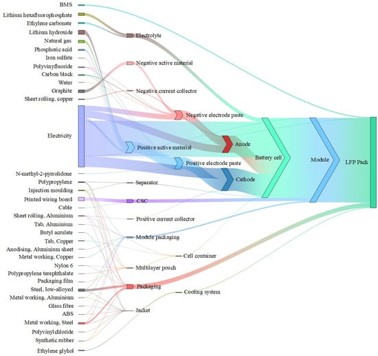 The life cycle inventory analysis of the battery production phase encompasses comprehensive data on the materials required, energy consumption, and emissions generated during the extraction of raw materials, manufacturing of components, and assembly and molding of the batteries. The production processes for LFP and NCM batteries in China exhibit substantial similarities, involving analogous components such as anodes, copper foil, aluminum foil, diaphragms, electrolytes, and casing components as shown in Figure 5. However, the cathode compositions differ distinctively: the LFP battery cathode is composed of an olivine-structured material primarily consisting of iron phosphate and lithium carbonate, which enhances battery safety and stability []. In contrast, the cathode of NCM batteries consists of ternary precursors of nickel, cobalt, and manganese metals; sulphate; and lithium carbonate, which form a hexagonal crystal layer structure of the α-NaFeO2 type, a structure that provides high energy density and excellent charging performance [,,]. Additionally, the energy structure within the production phase is meticulously calculated, accounting for the power structure, material mass, and energy flow specific to China. All materials and energy inputs are proportionally aligned with the functional unit of the product. Comprehensive inventory data are provided in Supplementary Material Background Data S1–S25, which detail every facet of the process from mineral resource extraction and transportation and processing of raw materials to the fabrication of battery components and final assembly, ensuring thorough and detailed coverage of the entire life cycle.