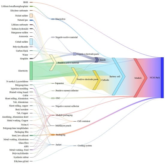 During the life cycle assessment phase, this investigation executed an exhaustive evaluation of the battery’s life cycle in accordance with the ISO 14040 standard [,,,], with particular emphasis on the quantification of the carbon footprint associated with the battery’s production phase. Product modeling was conducted utilizing Simapro 9.0 software, while the assessment of carbon footprint and environmental impact was performed via the ReCiPe2016 methodology [,]. The ReCiPe2016 assessment methodology consists of 18 environmental indicators, which are categorized into three main categories, namely, atmospheric impacts, water impacts, and terrestrial impacts. This comprehensive categorization facilitates a detailed evaluation of the resource and environmental impacts throughout the entire life cycle of the battery.
