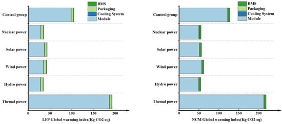 The global warming potentials of LFP and NCM batteries exhibit negligible variation among different energy sources, displaying analogous overarching trends. This implies that the selection of a battery type for manufacturing exhibits minimal influence on global warming potential when carbon emissions are considered, with the predominant determinant of carbon emissions being the origin of the electrical power utilized.