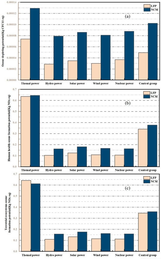 Overall, thermal power exhibits the most substantial ozone impact potential among the five evaluated energy sources, demonstrating markedly elevated values for both ozone depletion potential and ozone formation potential compared to the other energy types. In particular, the thermal power data using NCM batteries showed a higher ozone impact potential than the thermal power data using LFP batteries in all three aspects of ozone depletion and formation.