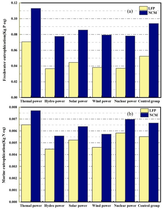In the present investigation, a comprehensive eutrophication assessment is undertaken, employing both freshwater eutrophication potential (FEP) and marine eutrophication potential (MEP) metrics, to elucidate the impacts of lithium iron phosphate batteries (LFP) and ternary lithium batteries (NCM) on aquatic ecosystems. With the two graphs in Figure 10, the different performances of different battery types (LFPs and NCMs) and different energy types (thermal, hydro, solar, wind, and nuclear) can be clearly seen in terms of freshwater and marine eutrophication potential. This meticulous comparative analysis elucidates a holistic understanding of the respective influences exerted by the two distinct battery types and the quartet of energy sources on the aquatic ecosystem.