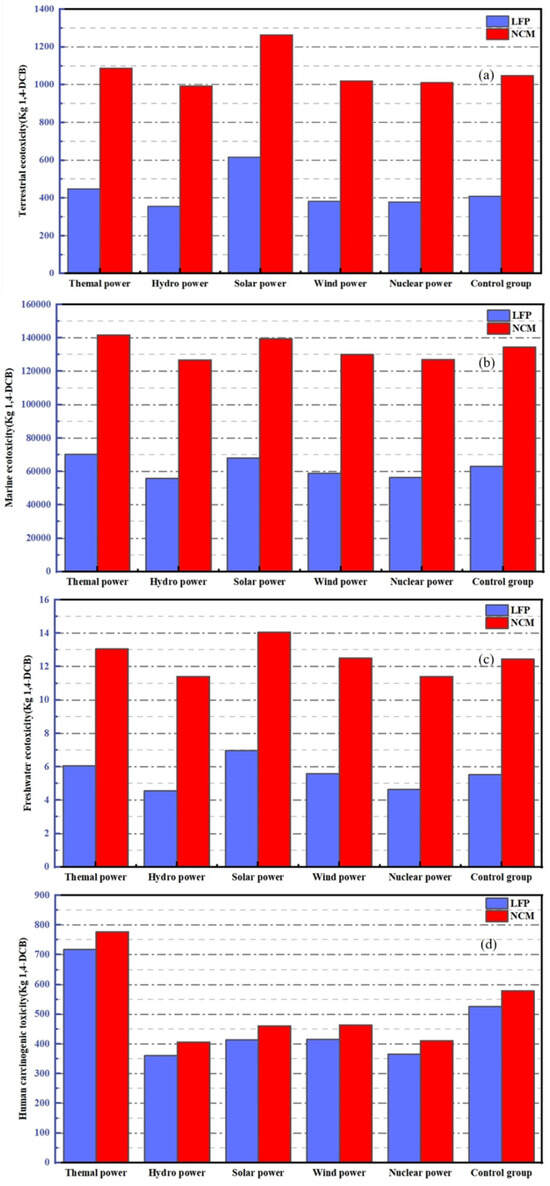 In terms of terrestrial eco-toxicity and freshwater eco-toxicity, solar power exhibits elevated values, predominantly attributable to the incorporation of toxic heavy metals, such as lead and cadmium, and other deleterious chemicals, including silicofluorocarbons, in the manufacturing process of solar cells, as well as the potential contamination of soils and bodies of water by improper recycling of panels at the end of the solar energy life cycle. In terms of marine eco-toxicity, the five energy types have a relatively even distribution of values and show similar levels of environmental impact. In the context of human carcinogenic eco-toxicity, the indices associated with thermal power generation significantly exceed those of the remaining four energy sources. This disparity underscores the advantages of adopting clean energy alternatives, not only for environmental sustainability but also for the enhancement of human health. Among the evaluated battery types, the values of NCM batteries are higher than those of LFP batteries, showing greater eco-toxicity, which indicates that NCM batteries need to be strictly controlled during the production process and the emission of pollutants should be strictly controlled to minimize their impact on the environment.
