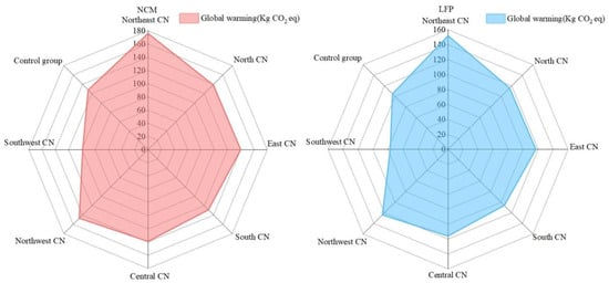 To elucidate the characteristics and inherent biases of the energy generation infrastructure across various regions, a comprehensive regional power generation map of China was developed. This map aligns the geographical divisions of China with the predominant power generation modalities within each region. The objective was to evaluate the global warming potential associated with the production of two distinct battery types, LFPs and NCMs, in different regions. The resultant data are presented in Figure 12 [].