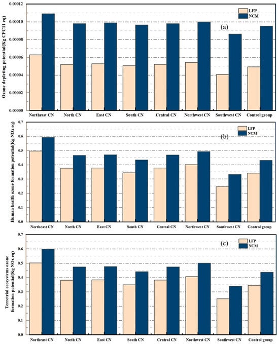 This section investigates the influence of two battery life cycle processes on the ozone layer, utilizing the ozone depletion potential (ODP), human health ozone formation potential (HOFP), and terrestrial ecosystem ozone formation potential (EOFP) metrics derived from the ReCiPe assessment framework. By comparing the three graphs in Figure 14, it can be seen that the ozone depletion potential of the NCM battery surpasses that of the LFP battery across nearly all geographical regions. The disparity is notably pronounced in the Northeastern region, where the prevalent reliance on thermal power generation, in conjunction with the region’s specific energy production characteristics, indicates a substantial potential for adverse effects on the ozone layer. Concurrently, the ozone formation potential of terrestrial ecosystems is also slightly higher for NCM batteries than for LFP batteries in most regions, suggesting a more pronounced detrimental effect on ecosystems.