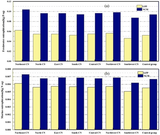 In contrast, the eutrophication potential of LFP batteries is relatively low in these regions, particularly in the Southern, Central, Northwestern, and Southwestern regions, where the freshwater and marine eutrophication potentials of LFP batteries are substantially lower compared to those of NCM batteries. The observed performance underscores the efficacy of LFP batteries in mitigating water pollution, thereby positioning them as superior alternatives in terms of environmental sustainability.