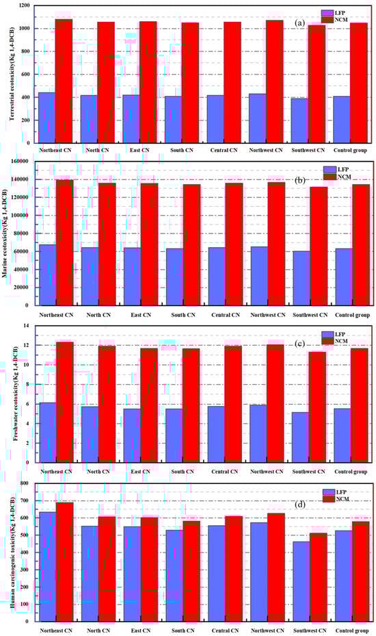 In the present investigation, the assessment of water eco-toxicity is categorized into two distinct components: freshwater eco-toxicity potential (FETP) and marine eco-toxicity potential (METP). Additionally, the evaluation of human eco-toxicity primarily focuses on the human carcinogenicity toxicity potential (HTPc). Terrestrial eco-toxicity is examined through the lens of terrestrial eco-toxicity potential (TETP). Upon meticulous examination of the four charts presented in Figure 16, it is evident that the regional disparities in terrestrial, marine, and freshwater ecosystem toxicity accounting are negligible. The variations in the recorded values are predominantly influenced by the specific type of battery under consideration. Notably, NCM batteries exhibit superior eco-toxicity and human carcinogenicity metrics compared to LFP batteries across all evaluated parameters. This suggests that, while NCM batteries may be superior in performance, they also have greater negative ecological impacts, particularly in terrestrial, marine, and freshwater ecosystems.