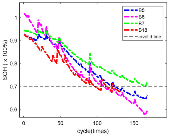 To calculate the battery capacity and each health characteristic, it is important to note that the SOH of the battery decreases from 100% to between 70% and 80% over its operational lifespan, ultimately reaching what is termed the end-of-life (EOL). Therefore, the remaining capacity of the battery during each cycle can represent the battery SOH.