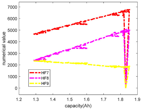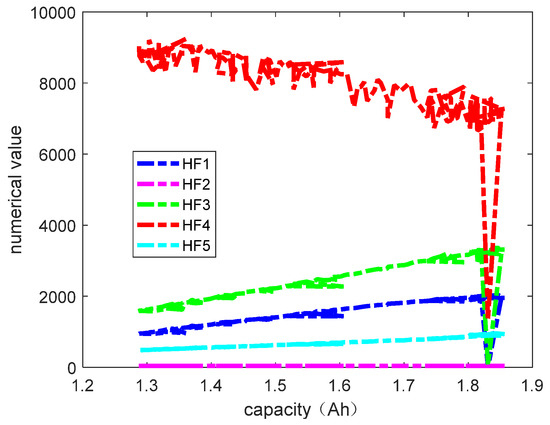 The first category of data is the following five types, constant voltage rise time (3.9–4.1 V) (HF1), maximum temperature during discharge (HF2), constant current charging time (HF3), constant voltage charging time (HF4), and constant voltage drop discharge time (HF5) as shown in Figure 2.