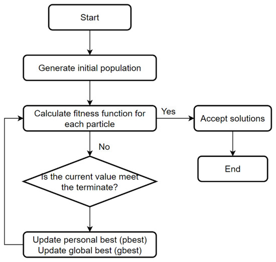 At present, there are many optimization methods for BP networks, and particle swarm optimization (PSO) is a commonly used method as shown in Figure 6. The PSO algorithm simulates biological populations through particles, in which particles have two basic properties: speed and position. Speed represents the speed of movement, and position represents the direction of movement. Each particle moves freely in the solution space to seek the optimal solution. In the process of seeking the optimal solution, each particle has individual behavior and group behavior. Each particle will learn from two values, one is the individual’s historical optimal solution , and the other is the group’s historical optimal solution . The particle will continuously adjust its speed and position through this learning process, and the quality of each position is determined by fitness. The fitness function serves as the objective function for the optimization process.