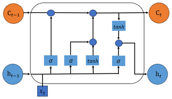 The feature maps extracted by the CNN from the original data are input into the subsequent long short-term memory (LSTM) layer to achieve capacity prediction. LSTM can achieve better prediction for time-related features by learning short-term and long-term dependencies. The basic structure of LSTM is illustrated in Figure 7.