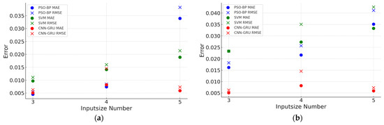 PSO-BP and SVM dimensional experiment for B5. (a) PSO-BP results for different input size; (b) SVM results for different input sizes.
