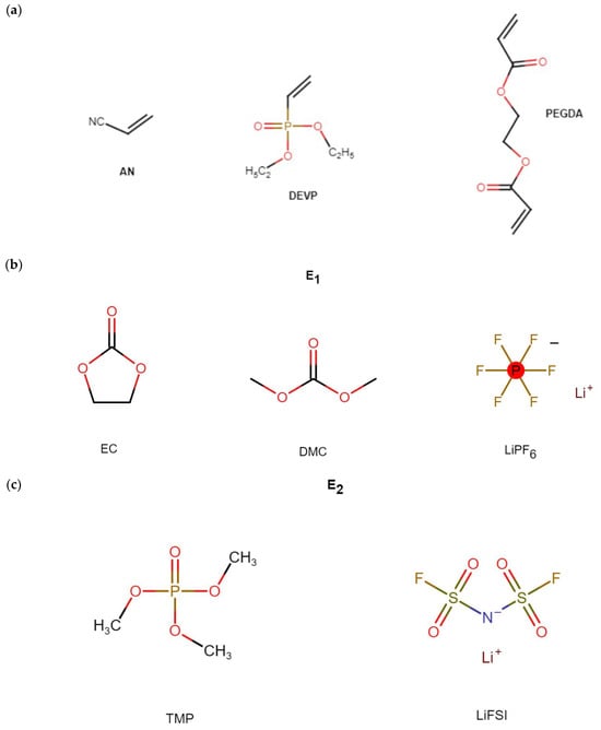 (a) Monomer structures of the 3D-ADCL-PE; (b,c) structures of the solvents and salts used as electrolytes: E1 and E2, respectively.