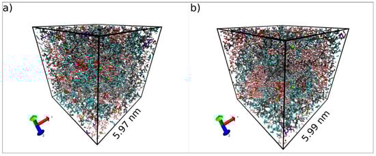 MD equilibrated GPE: (a) 3D cross-linked polymer plus 1 M Li PF6 in EC/DMC; (b) 3D cross-linked polymer and 1 M LiFSI in TMP. Boxes are cubic and have the same dimensions in all xyz coordinates.