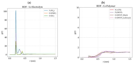 (a) Li-X RDFs associated with all inter-atomic distances among Li ions and atoms of the GPE E2 for electrolyte components; (b) RDF associated with the atoms of the functional groups of the cross-linked polymer.