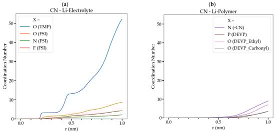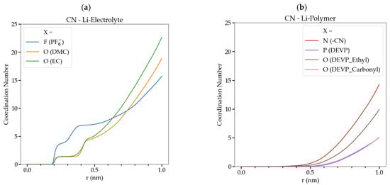 (a) CN associated with all the atoms interacting with Li+ in GPE E2. for the electrolyte atoms and (b) CN of the atoms of the functional groups of the cross-linked polymer.