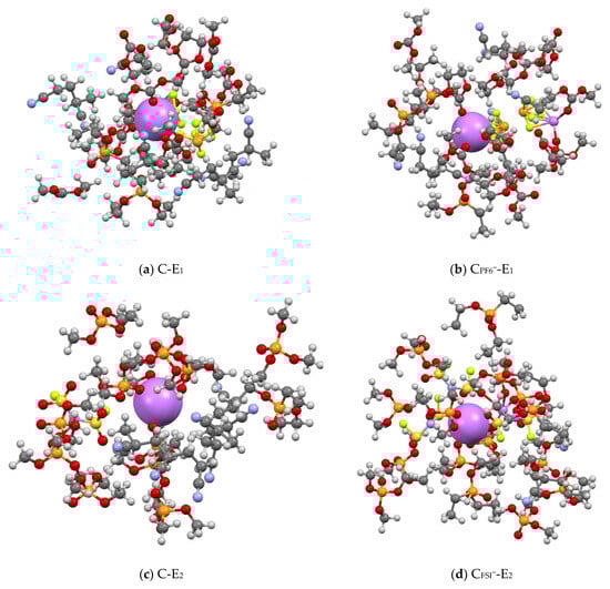 Overall, four clusters were extracted. Clusters C-E1 and C-E2 consisted of different Li cations surrounded by cross-linked polymer chains and solvent molecules without PF6− or FSI− counter-anions. Instead, CPF6−-E1 and CFSI−-E2 included lithium ions, polymer chains, and counter-anions. The average total number of atoms included in each cluster is 310. The preparation of the clusters was carried out by identifying Li⁺ ions that adhered to the observed RDF behavior, i.e., Li⁺ that consistently resided near solvent molecules and counter-ions. It is important to emphasize that the RDF analysis showed the absence of close interactions between Li⁺ and the polymer matrix’s functional groups (N from AN, O, or P from DEVP), as Li⁺ ions were constantly found in proximity to solvent or counter-anion molecules, which act as a shield between Li⁺ and polymer chains. Finally, in order to capture the surrounding atomic environment, all atoms within a radius of 1 nm from a target Li⁺ were included in the clusters. Remember that the dimension of the complete equilibrated GPE box is 5.92 nm.
