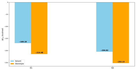 As shown in Figure 8, the interaction energies referring to the two electrolyte systems show significant differences. In the E1 system, the of Li⁺ with the solvent (DMC/EC) was −169.18 kcal/mol, but the interaction with the whole electrolyte, i.e., incorporating the PF6− counter anions, yielded a more substantial of −214.48 kcal/mol. This demonstrates that PF6− plays a crucial role in the solvation shell surrounding Li⁺. E2 exhibited stronger interactions overall compared to E1. The interaction energy between target Li⁺ and solvent molecules (TMP) was −204.82 kcal/mol, but incorporating the effect of FSI⁻ counter anions further increased, in absolute value, the to −252.13 kcal/mol. The increased interaction energies in this system underscore the stabilizing influence of FSI−, which surpasses that of PF6− in the EC/DMC system.