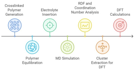 The combined DFT and MD protocol used in this study is quite general and adaptable, especially for preparing 3D cross-linked polymers. This flexibility makes them applicable to a variety of systems where cross-linking effects are important [36]. It is worth noting that we applied this protocol to systems with linear, non-cross-linked polymer chains [37,38], showcasing their versatility. Thus, these simulations offer valuable insights into how the cross-linking influences molecular interactions and ion transport. By exploring pore formation, molecular distribution inside the polymer matrices, structural stability, and ion mobility, this approach deepens our understanding of the system under study and opens opportunities for optimizing similar polymer-based electrolyte systems for advanced Li batteries.