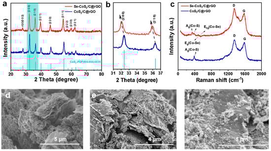 (a,b) XRD patterns of CoS2/C@rGO and Se-CoS2/C@rGO, (c) Raman spectra of CoS2/C@rGO and Se-CoS2/C@rGO, (d) SEM images of CoS2/C@rGO and (e,f) Se-CoS2/C@rGO.