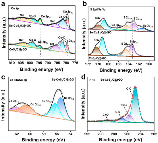 X-ray photoelectron spectroscopy (XPS) was employed to analyze the elements and valence states of the CoS2/C@rGO and Se-CoS2/C@rGO samples. As shown in Figure S3, the survey XPS spectrum of the Se-CoS2/C@rGO confirms the presence of Co, Se, S, and C elements in the composite. In the high-resolution Co 2p XPS spectrum of CoS2/C@rGO (Figure 3a), the main peaks at 779.1 and 794.2 eV correspond to the spin-orbit characteristic peaks of Co 2p3/2 and Co 2p1/2 in CoS2, respectively [33]. The peaks at 782.1 and 798.3 eV are associated with the surface CoOx species. Additional peaks at 785.8 and 803.7 eV are attributed to the satellite peaks of Co 2p, associated with oscillatory excitation of high-spin Co2+ ions, demonstrating the presence of cobalt (II) [41,42]. After Se substitution, the Co 2p3/2 peak shifts to a lower binding energy (from 779.1 eV to 778.8 eV), indicative of Co atoms bonding with the less electronegative Se atoms. This shift suggests that the selenium substitution can modulate the d-band electronic structure of the Co atoms. In the high-resolution S 2p spectrum of CoS2/C@rGO (Figure 3b), the spin-orbit doublets at 163.1 and 164.3 eV correspond to the S 2p3/2 and S 2p1/2, respectively [26]. Furthermore, the broad peaks at 169.2 and 170.3 eV are assigned to the surface sulfur oxide species (SOx). With Se incorporation, the S 2p peaks of Se-CoS2/C@rGO shift to lower binding energies, indicating successful Se doping in CoS2 crystals that enriches the electron cloud around the S atoms [43]. Additionally, the doublet peaks at 161.1 and 166.0 eV correspond to the Se 3p3/2 and Se 3p1/2, respectively, confirming successful Se doping. The Se incorporation was further verified by the Se 3d spectrum, where the peaks 55.4 and 56.3 eV are assigned to the Se 3d5/2 and Se 3d3/2, respectively (Figure 3c). The C 1s spectrum of Se-CoS2/C@rGO (Figure 3d) can be deconvoluted into four peaks at 284.8, 285.4, 285.9, and 288.8 eV, representing C-C, Se-C, S-C, and C=O bonds, respectively [44,45]. The C 1s spectrum indicates the formation of a S, Se-codoped carbon matrix from the sulfurization/selenization process.