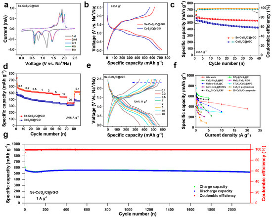 Figure 5d,e display the rate capability of the CoS2/C@rGO and Se-CoS2/C@rGO. It is evident that the Se-CoS2/C@rGO composite exhibits superior rate capability compared to the CoS2/C@rGO electrode, showing specific capacities of 560, 533, 519, 508, 499, 480, 442, and 351 mAh g−1 at current densities of 0.1, 0.2, 0.5, 1, 2, 5, 10, and 20 A g−1, respectively. When the current density turns back to 0.1 A g−1, the specific capacity can recover to 519 mAh g−1, indicating the good reversibility. The excellent rate capability of Se-CoS2/C@rGO is attributed to the synergistic effect of Se substitution and dual carbon matrix incorporation that facilitate fast electron/Na+ transportation. The outstanding rate capability of Se-CoS2/C@rGO is one of the best among all the CoS2-based materials for SIBs (Figure 5f) [46,47,48,49,50,51,52,53,54]. Then the long-term cycling performance of the Se-CoS2/C@rGO electrode was tested at a current density of 1 A g−1. As depicted in Figure 5g, the Se-CoS2/C@rGO electrode exhibited a high specific capacity of 529.5 mAh g−1 after 2100 cycles, corresponding to an ultrahigh capacity retention of 93.5% (0.003% capacity decay per cycle). Compared with other CoS2 materials, Se-CoS2/C@rGO materials possess higher specific capacity, better charge-discharge efficiency and longer cycle life [50,51,52].