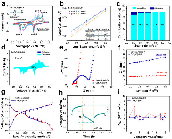 (a) Scan-rate-dependent CV curves, (b) the plots of log i and log v at each redox peak, (c) the normalized percentage of capacitive contributions at distinct scan rates, (d) capacitive charge contribution at 1.0 mV s−1, (e) the initial EIS patterns, (f) relationship of Z’ versus ω−1/2, (g) GITT profiles at pulse current of 0.2 A g−1, (h) voltage (V) versus time (t) profiles of the Se-CoS2/C@rGO electrode for a single GITT during the discharge process, (i) the corresponding DNa+ values.