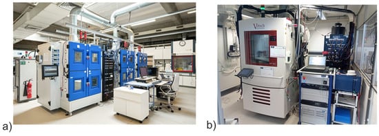 - Two independent and identical Vötsch VCS3 7060-5 climate chambers (see Figure 1b), with a temperature control range between −55 °C and 155 °C and a humidity range of 10% to 98% RH. Each chamber has a volume of 600 l. The temperature deviation in the center of working space is ±0.5 °C.