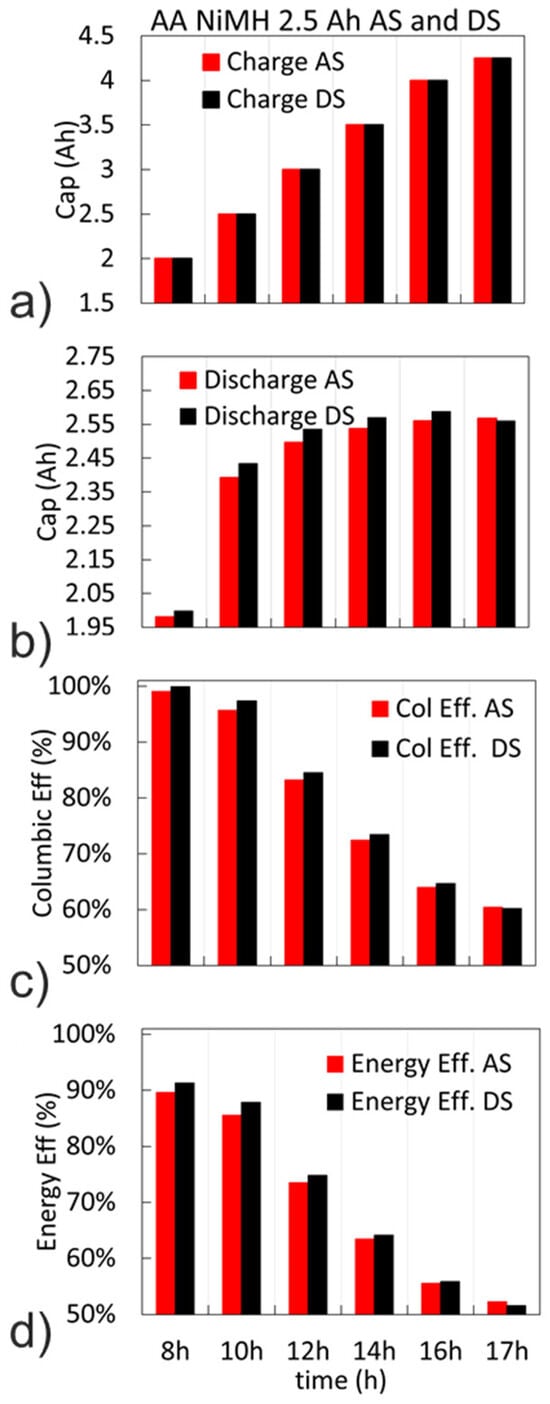 We observed in Figure 2a that charging the AA NiMH battery for longer periods of 10 h does not affect the battery’s discharge capacity of 2.5 Ah (see Figure 2b). In terms of efficiency, the highest columbic and energy efficiency is observed at 8 h for AS and DS experiments (see Figure 2c,d).