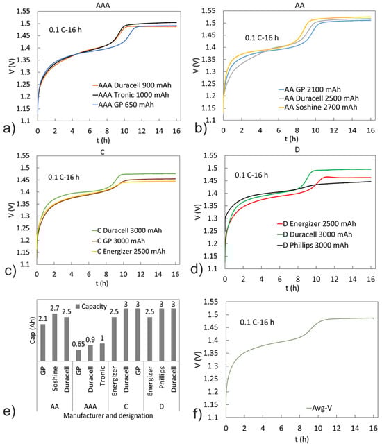 NiMH battery charge profile at 0.1 C and 16 h of different battery manufacturers of (a) AAA, (b) AA, (c) C, (d) D, (e) rated capacity, manufacturer, size, and (f) average charging voltage profile.