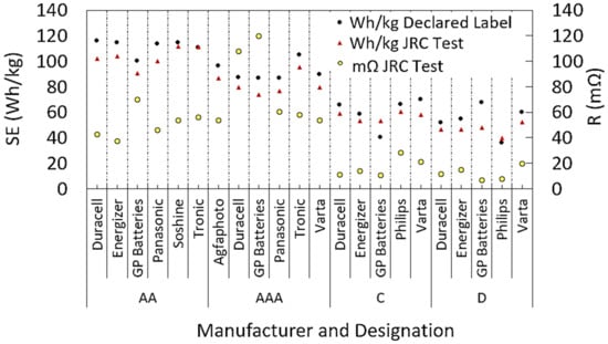 The selected portable NiMH batteries exhibit different internal resistances ranging from 2 mΩ up to 130 mΩ (see Figure 4). Increasing the size of the batteries tends to correlate with lower internal resistance. A “D” NiMH battery has a larger cell construction than a “AAA” battery (diameter of “AAA” 10 mm and “D” 33 mm); thus, the D battery has a greater electrode contact area with the electrolyte, reducing the internal resistance []. While the internal resistance is lower in bigger NiMH batteries (C and D designations), the specific energy density of the NiMH batteries is larger in AA and AAA batteries (see Figure 4). In all cases, there are differences between the rated capacity (Wh/kg declared label) and the tested capacity (Wh/kg JRC test). In most cases, the capacity declared by the manufacturer is larger than the capacity measured in this study. These differences could be related to the manufacturer’s date of production, testing equipment, changes in the cell during transportation and distribution, to name a few.