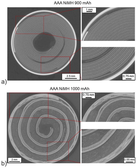 There are different design approaches for NiMH batteries depending on the manufacturer and application. In the case of the AAA NiMH of 900 mAh (see Figure 5a), the thickness of the electrode ensemble is small (0.1–0.2 mm); this allows for a high number of windings inside the battery casing (23 turns). The high number of windings is considered a method to increase both cell mechanical stability and cycle life []. In the other case, the AAA NiMH of 1000 mAh (see Figure 5b), the ensemble of separator and electrodes has a thickness of 0.5–0.7 mm and is wound four times. The electrodes with higher thickness in this case are of the felt structure type, with an increase in surface area that could increase the capacity of a battery [].